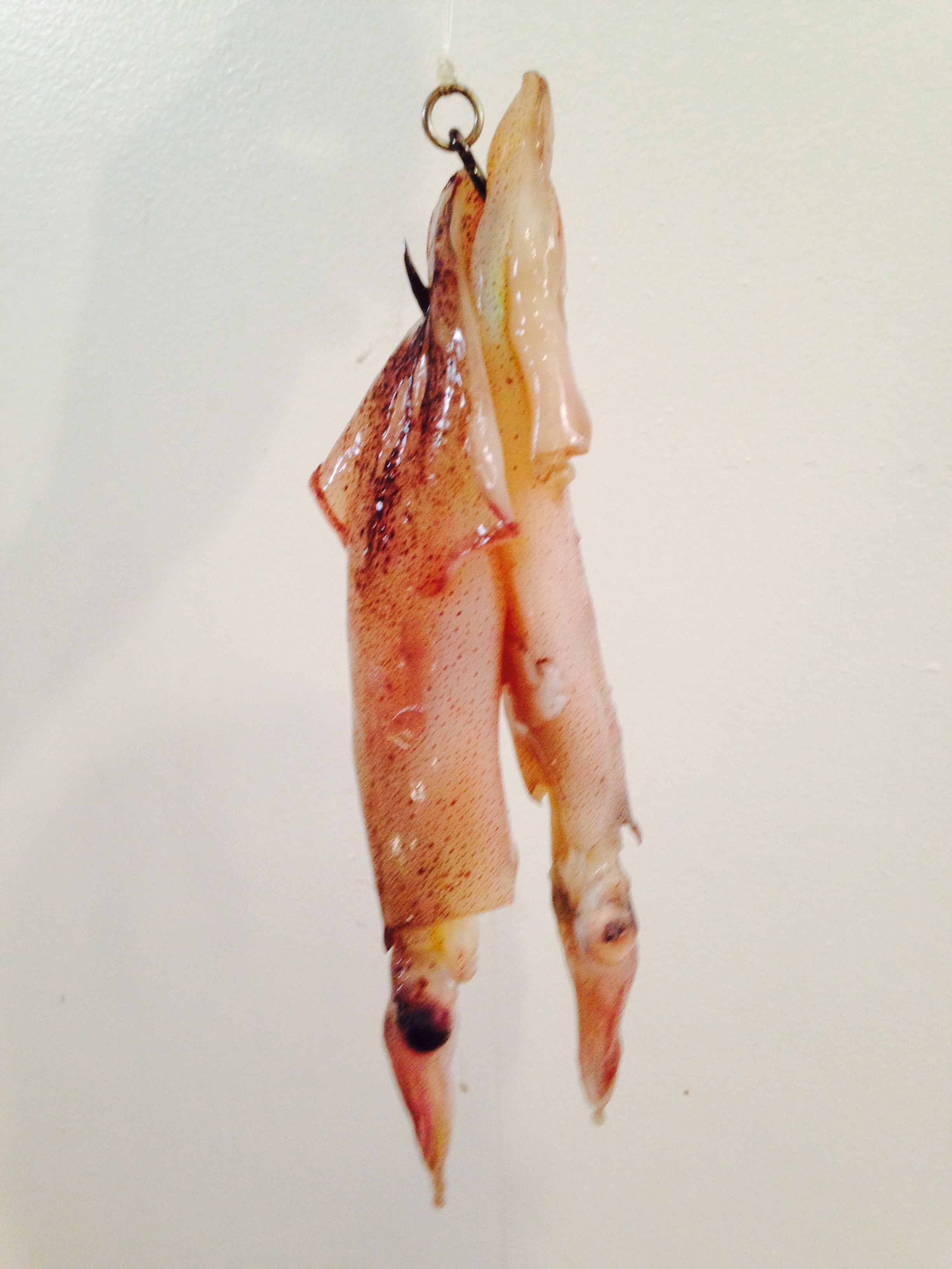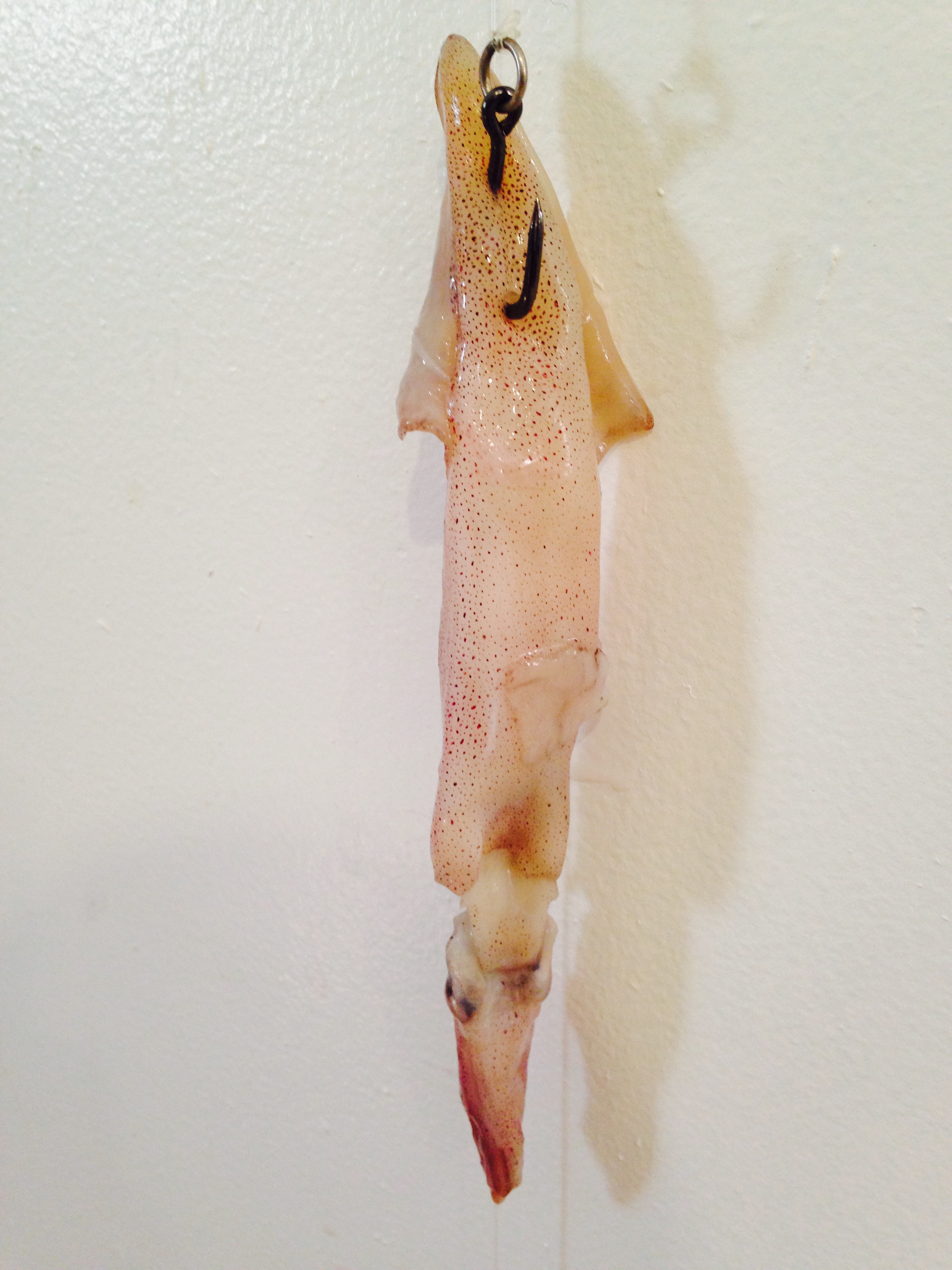 Baiting squid. Twice through the end of the mantle. (Once first at the very end, 1/2” down, turn 180 & back through & in-between the middle fins.