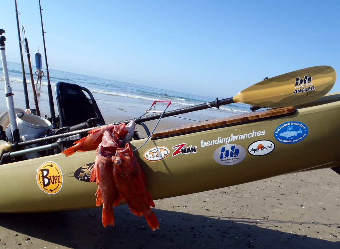(Or bucktail jig, ect.) A softer durometer plastic bait translates to more than a longer lasting plastic bait against toothy critters. The softer ElaZtech material allows for more solid hook sets when rigged weedless, and you don’t have to precut belly slots, as Z-Man’s entire lineup has belly-slots and/or fin-slot protectors to help keep you truly weedless & their super soft space age plastic = incredibly lifelike action. Its frequent to deck rockfish that puke up small octopus & squids from encountering ‘the benz’, so most colorways I throw are in the Pearl range, Bubblegum, Nuked Pilchard Glow, Smokey Shad & Baby Bass to mimic the finbait forage too. Guaranteed solid Southern California rockfish limits can easily be had across our coastline with just a couple proper kayak rigs. Most paddle kayakers get discouraged on account of the current by constantly trying to stay on top of their mark & getting blown all around. This simple feat is achieved by lightly peddling your MirageDrive over your mark, with rod in hand in wait. Spectra line is an absolute must while kayak rockfishing. NO mono except for a short 3-4’ leader (I.E.: From the Spectra is allowed for this productive recipe.) Fishing that deep, you need instant hook sets and no stretch, no slack. Go ahead and fish your mono, and chances are the good ones will shake you off and strip you before you can ever set the hook. 30-40# Fluorocarbon isn’t necessary on rockfish rigs for its invisibility properties, but for its abrasion resistance on account of getting chafed being only 1 crank off the bottom.