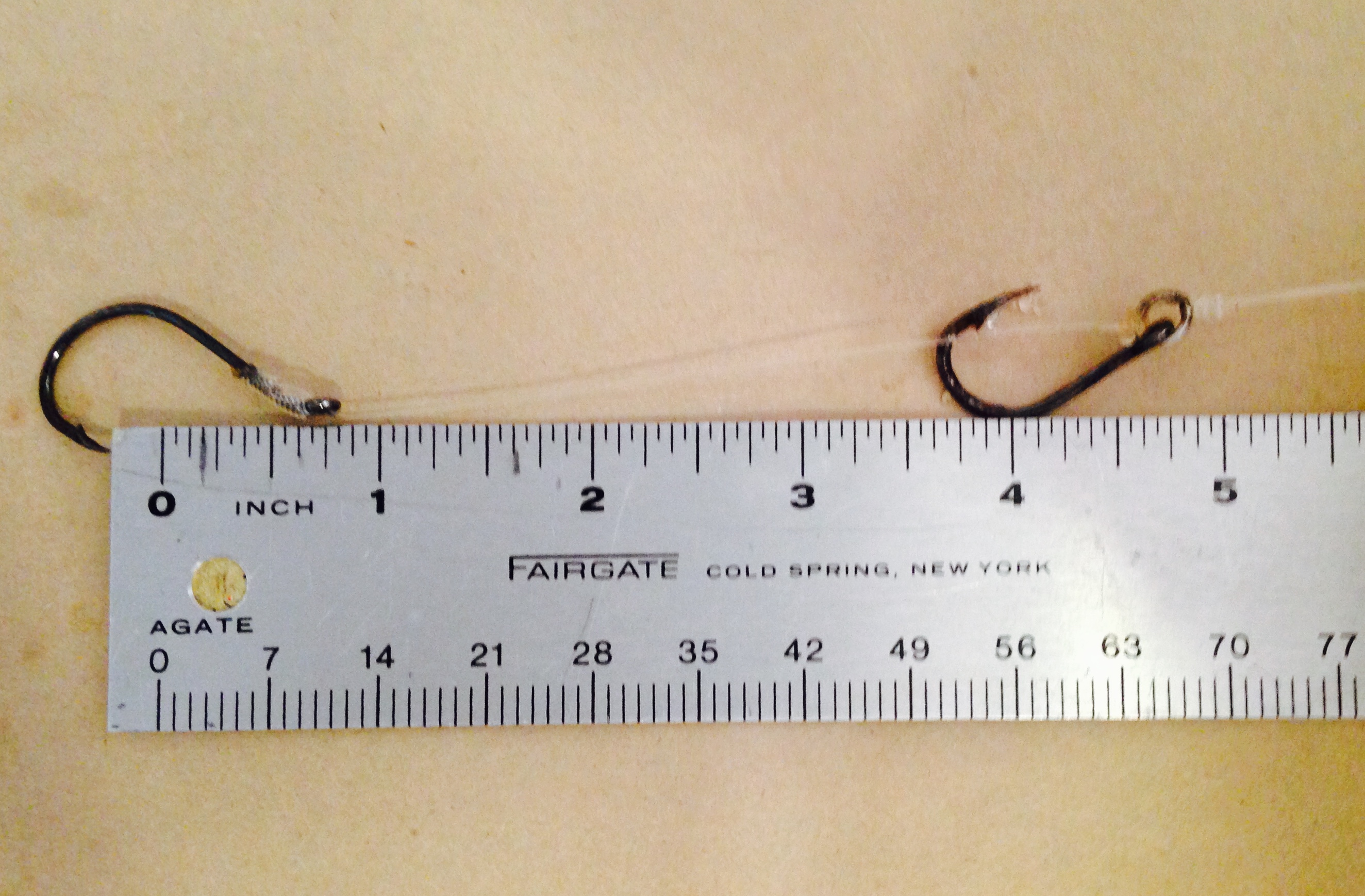 Short Stinger on a dropper loop, / ‘The Bacon Bringer’. First pin the ringed hook the same way double pinned at the end of the mantle. Run the short octopus hook stinger, through & out the end of the squids neck and into & out of the head. (The squids tentacles are the real attention grabber.) (Once the head is ripped off, its best to just save that lifeless “tube” for strips when you run out of squid at the end of the day. / Mental note # 24: Try and not set the hook on the pesky lil’ ones aka machine gunners..) Any basic snell or egg drop loop will suffice to make this simple effective rig.